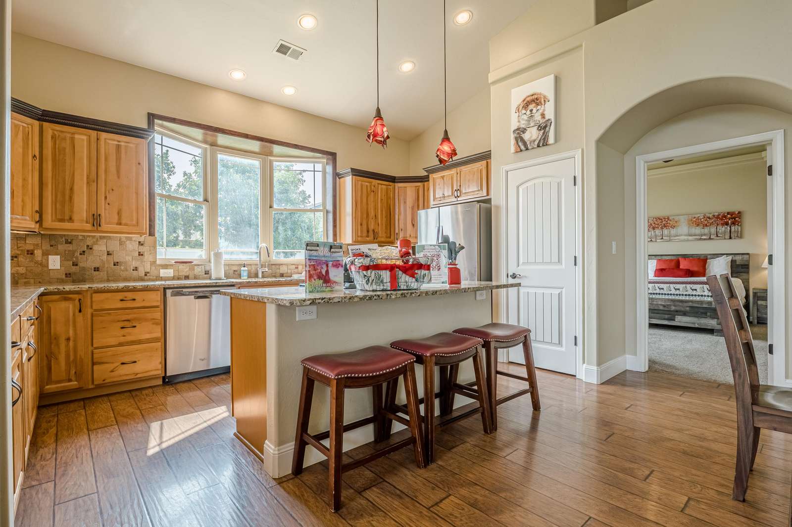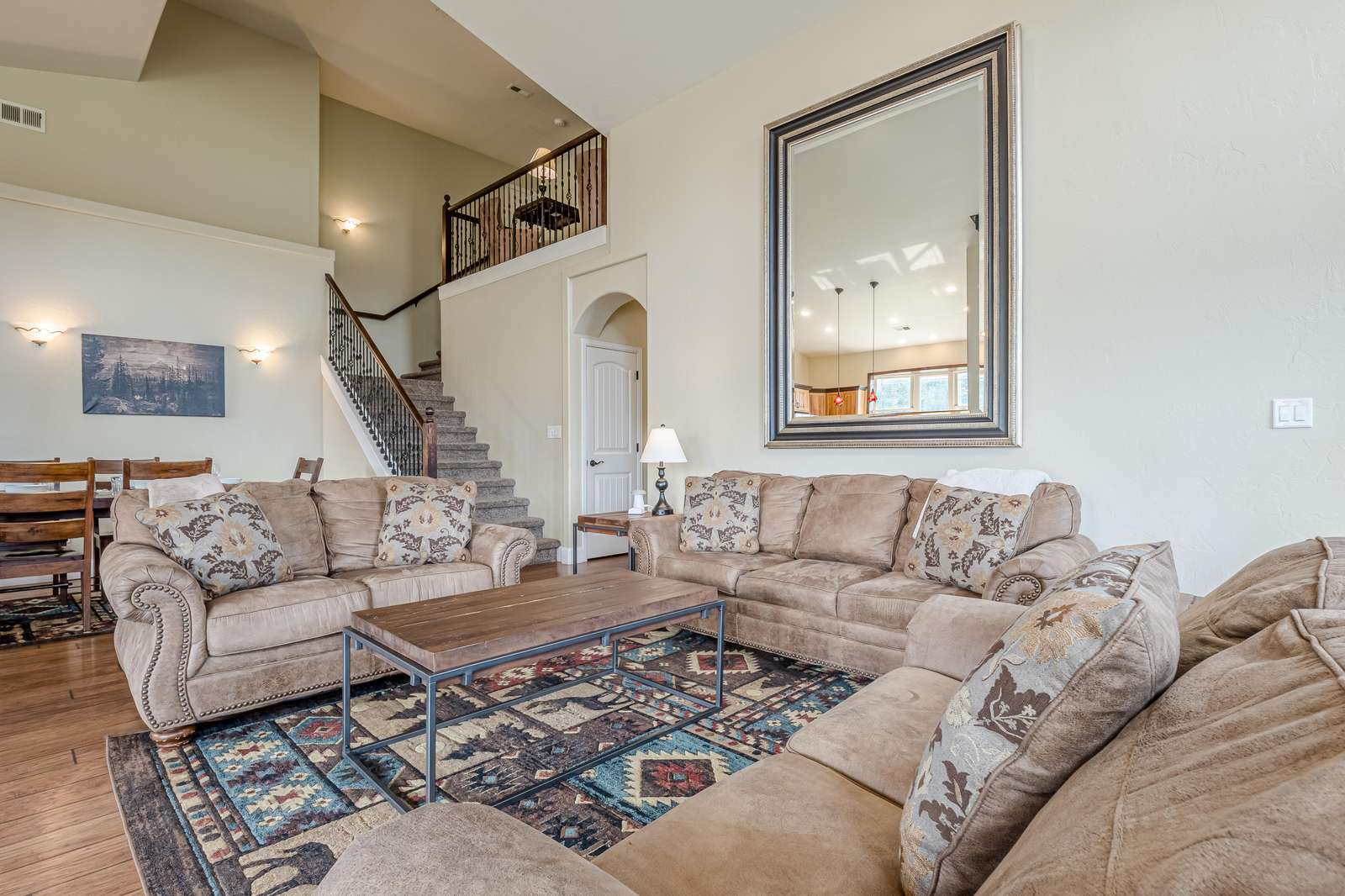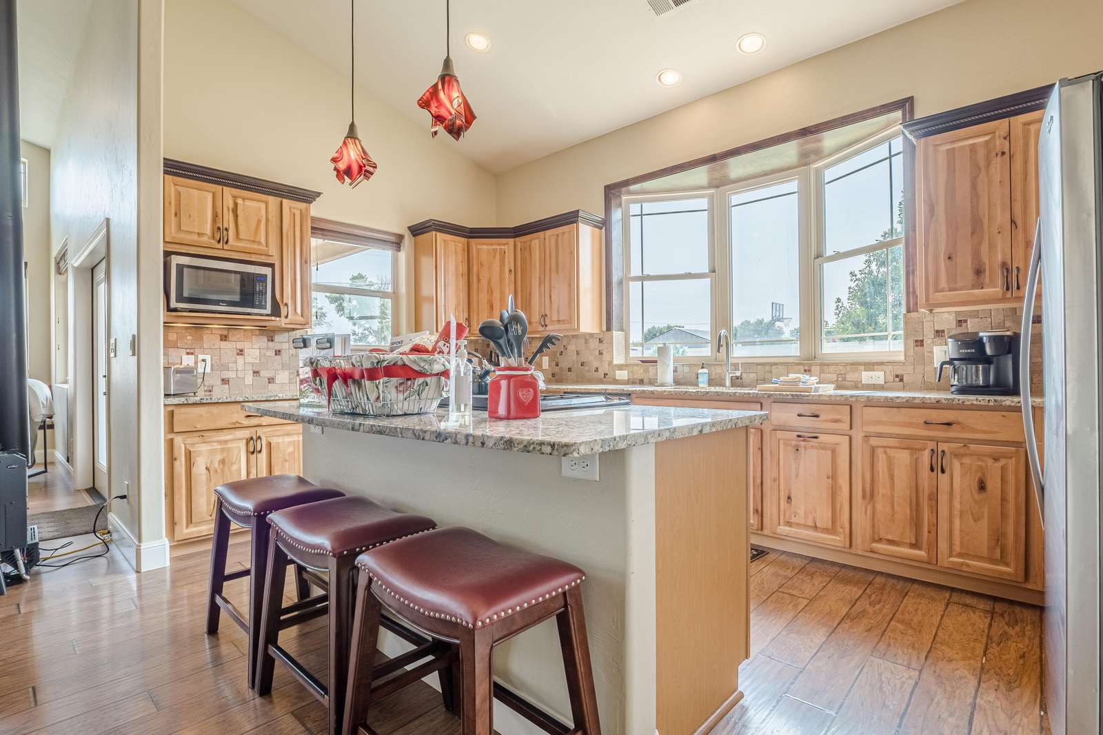 + Modern Kitchen: Prepare delicious meals with ease using our updated kitchen appliances, including a convenient full-size coffee maker/Keurig combo.