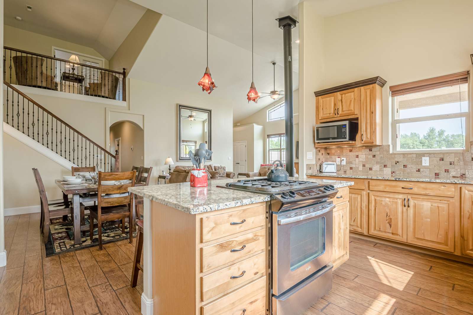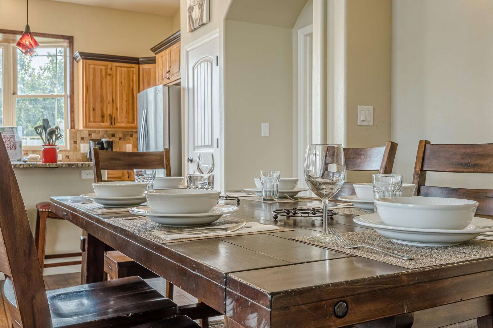 + Family Dining: Share memorable meals around the large dining table, comfortably seating six guests, with additional seating for two at the lunch counter.