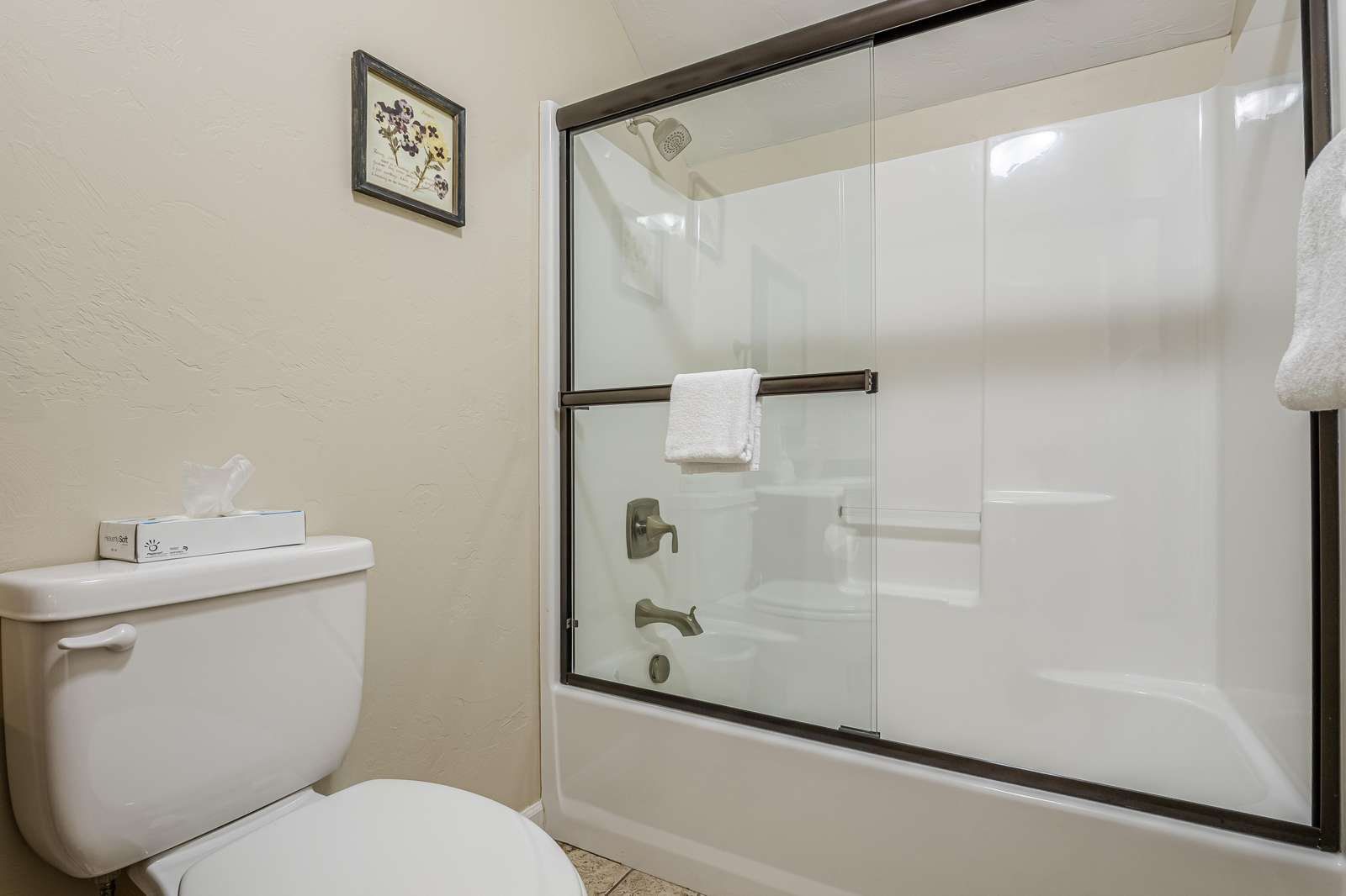 + The shared bathroom located on the main level has a toilet, sink, and a shower/tub combo.