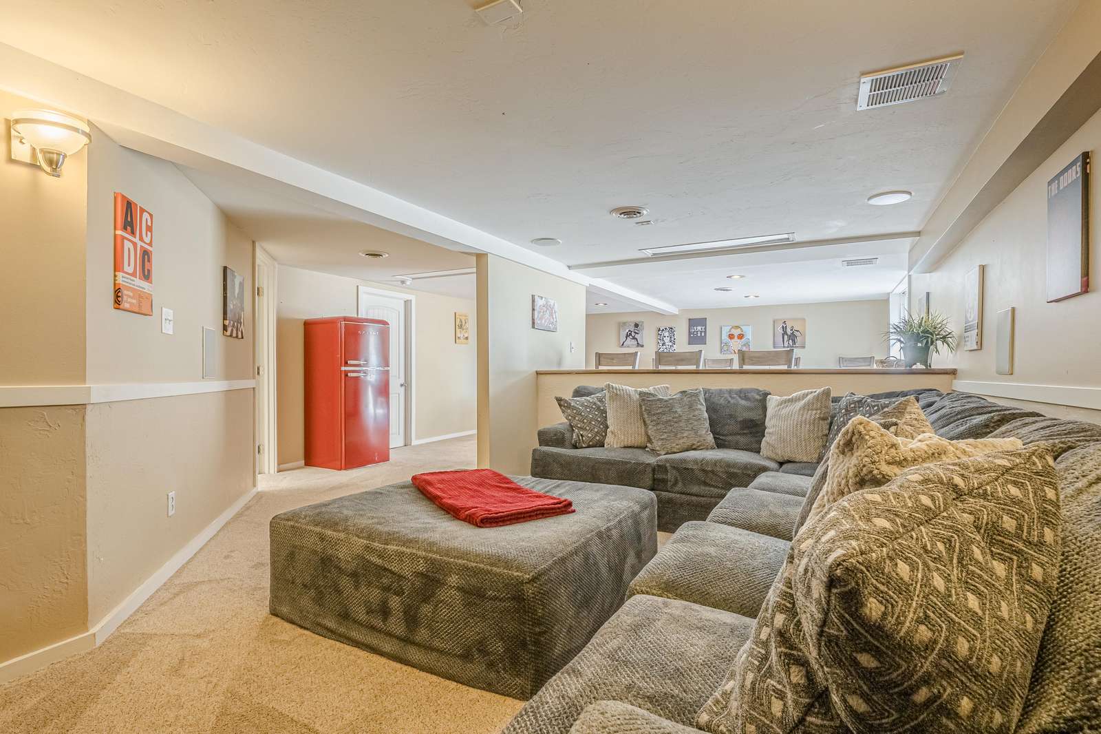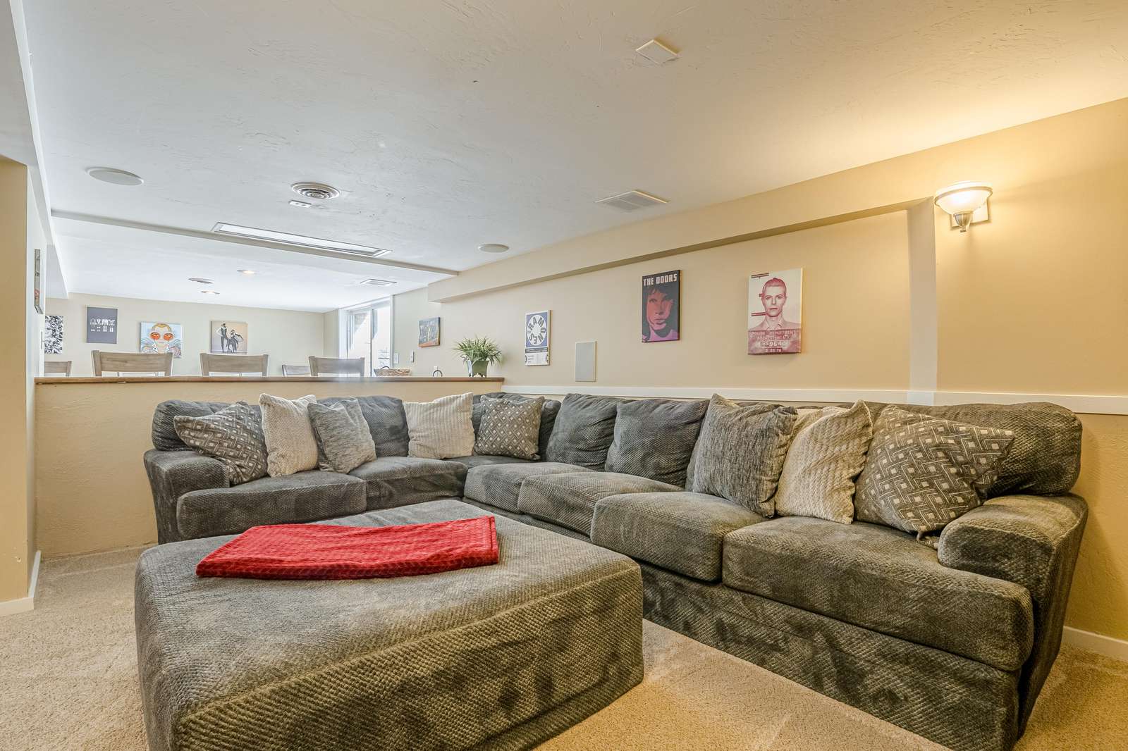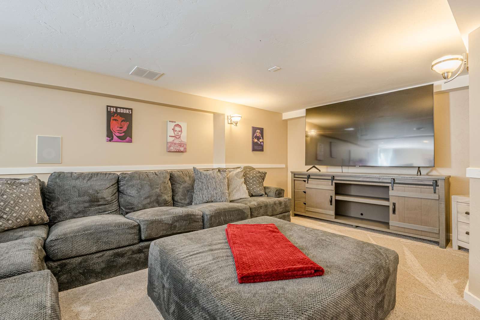 + Entertainment Room: Relax on comfy, deep-cushioned couches while enjoying the 82" flat-screen Smart TV with access to all your favorite streaming apps.