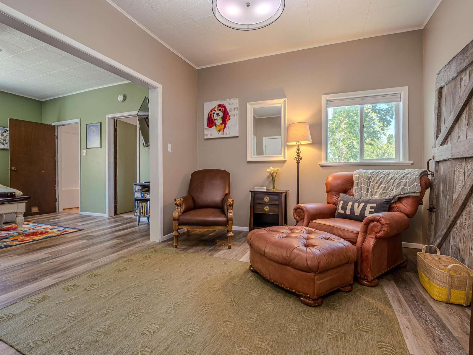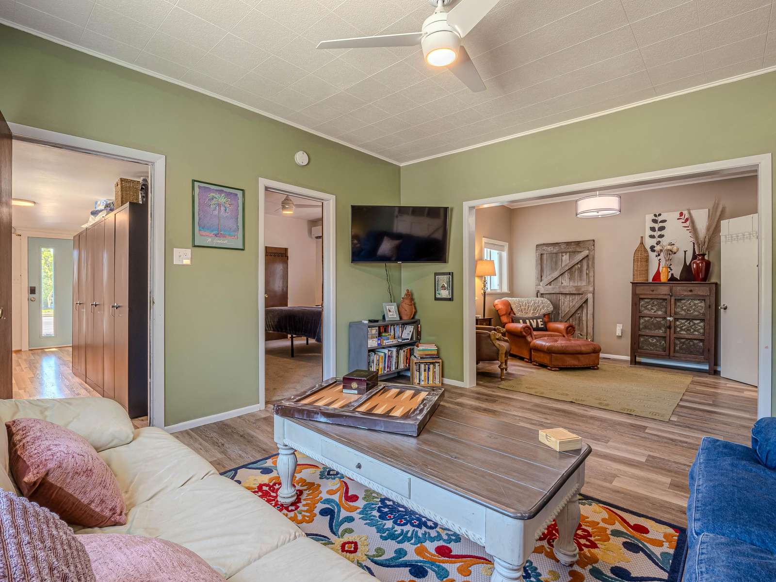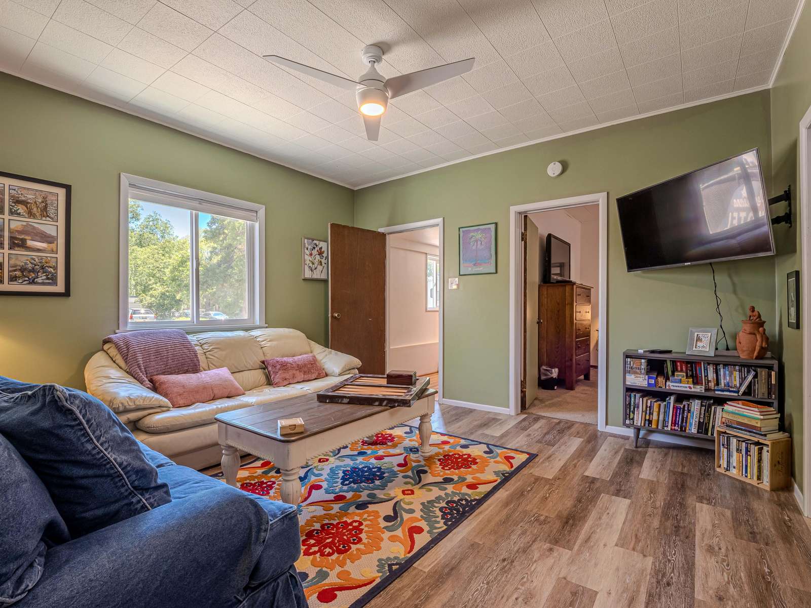 + Inviting Living Space: Unwind in the bright living room with ample plush seating and a flat-screen smart TV for entertainment.