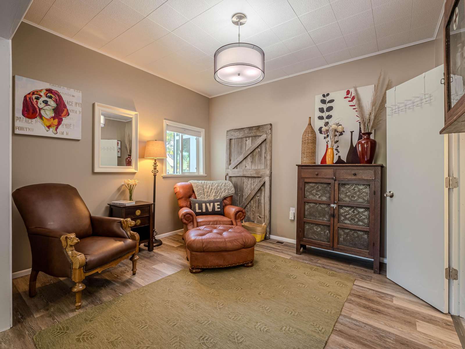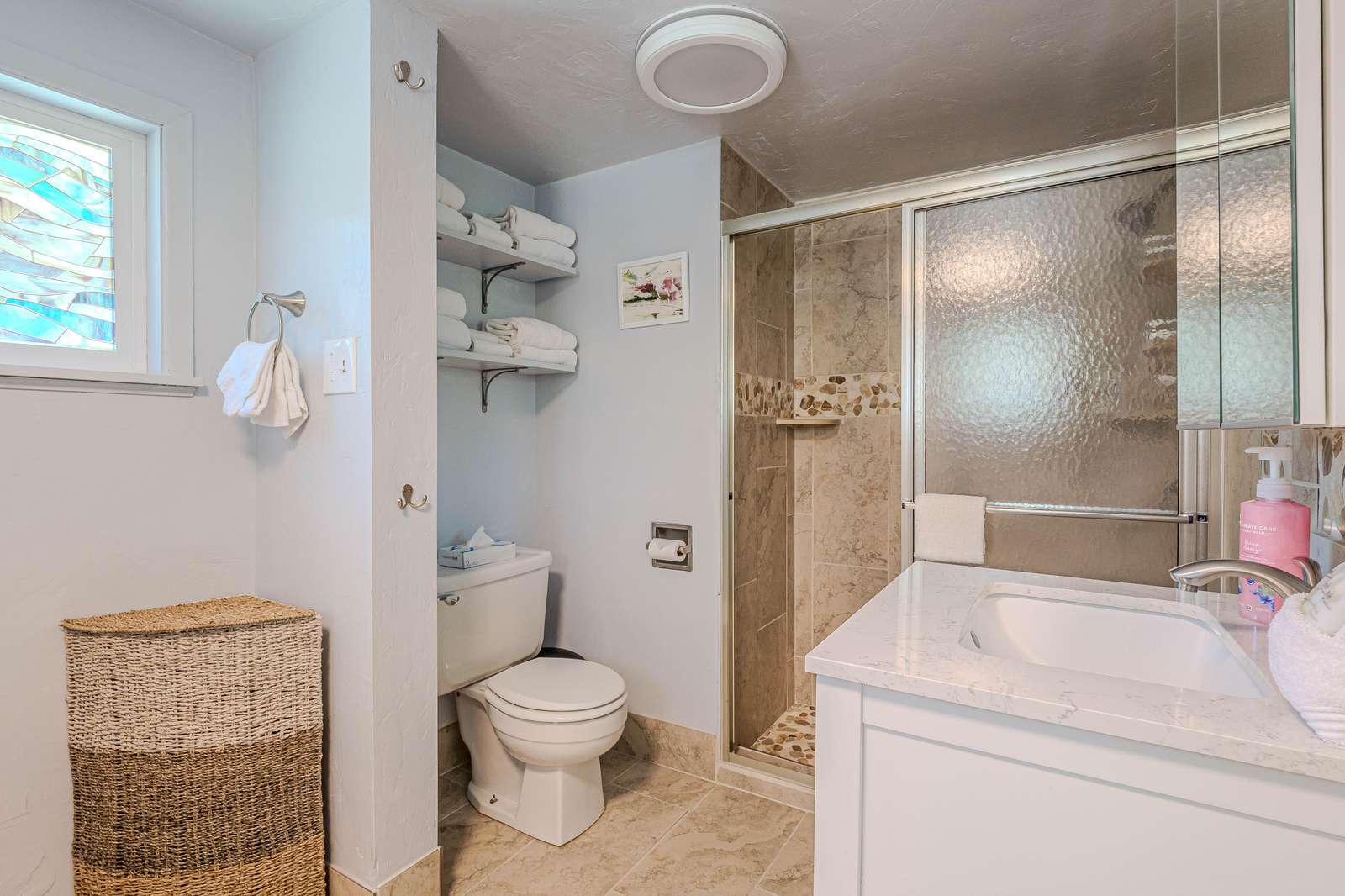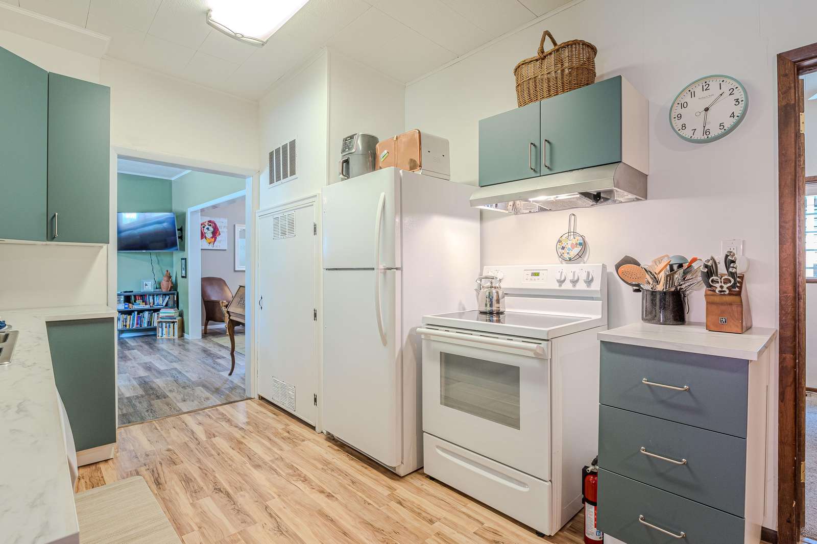 + Inviting Living Space: Unwind in the bright living room with ample plush seating and a flat-screen smart TV for entertainment.