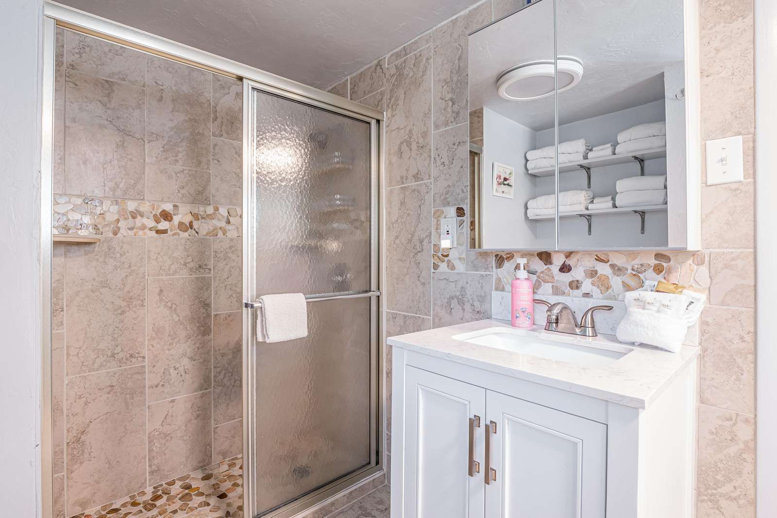 + The 1st shared bathroom has a toilet, sink, and a step-in shower.