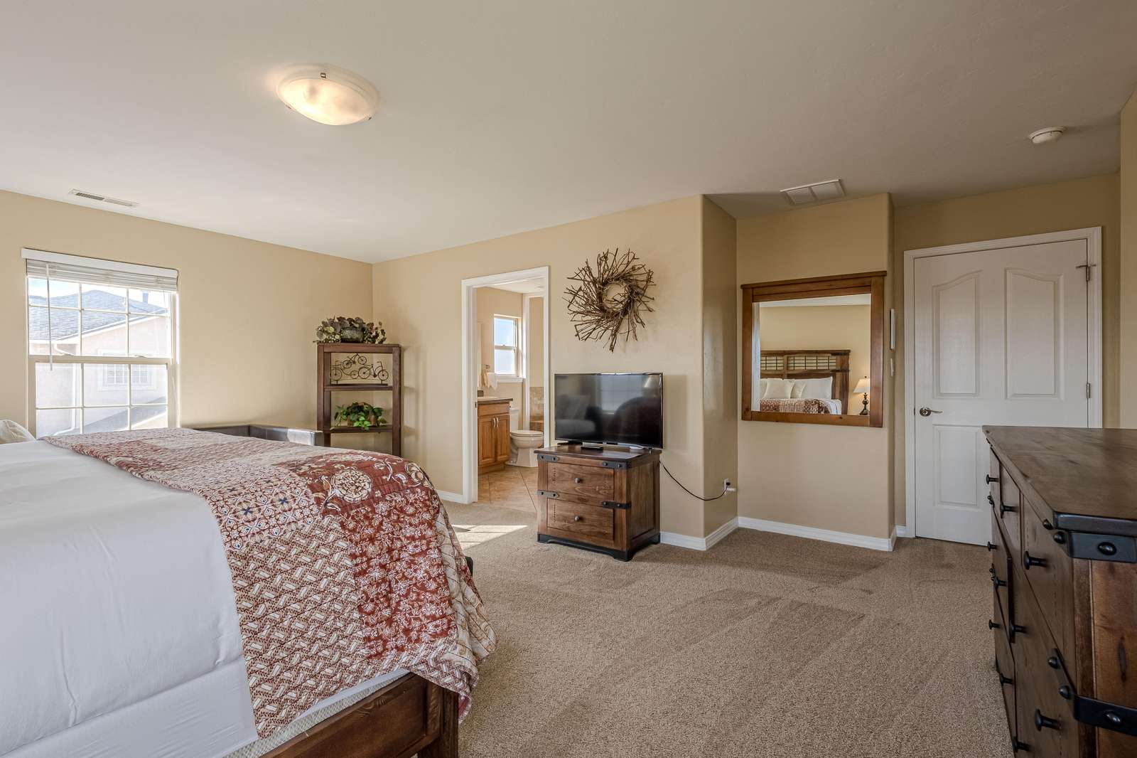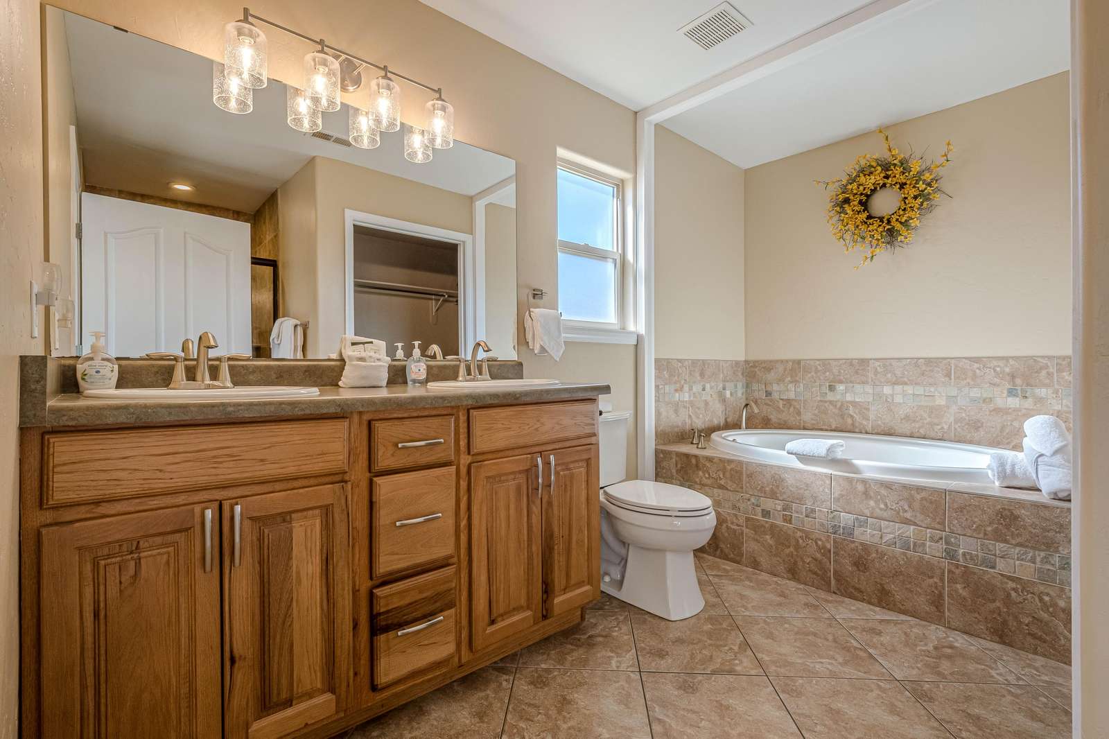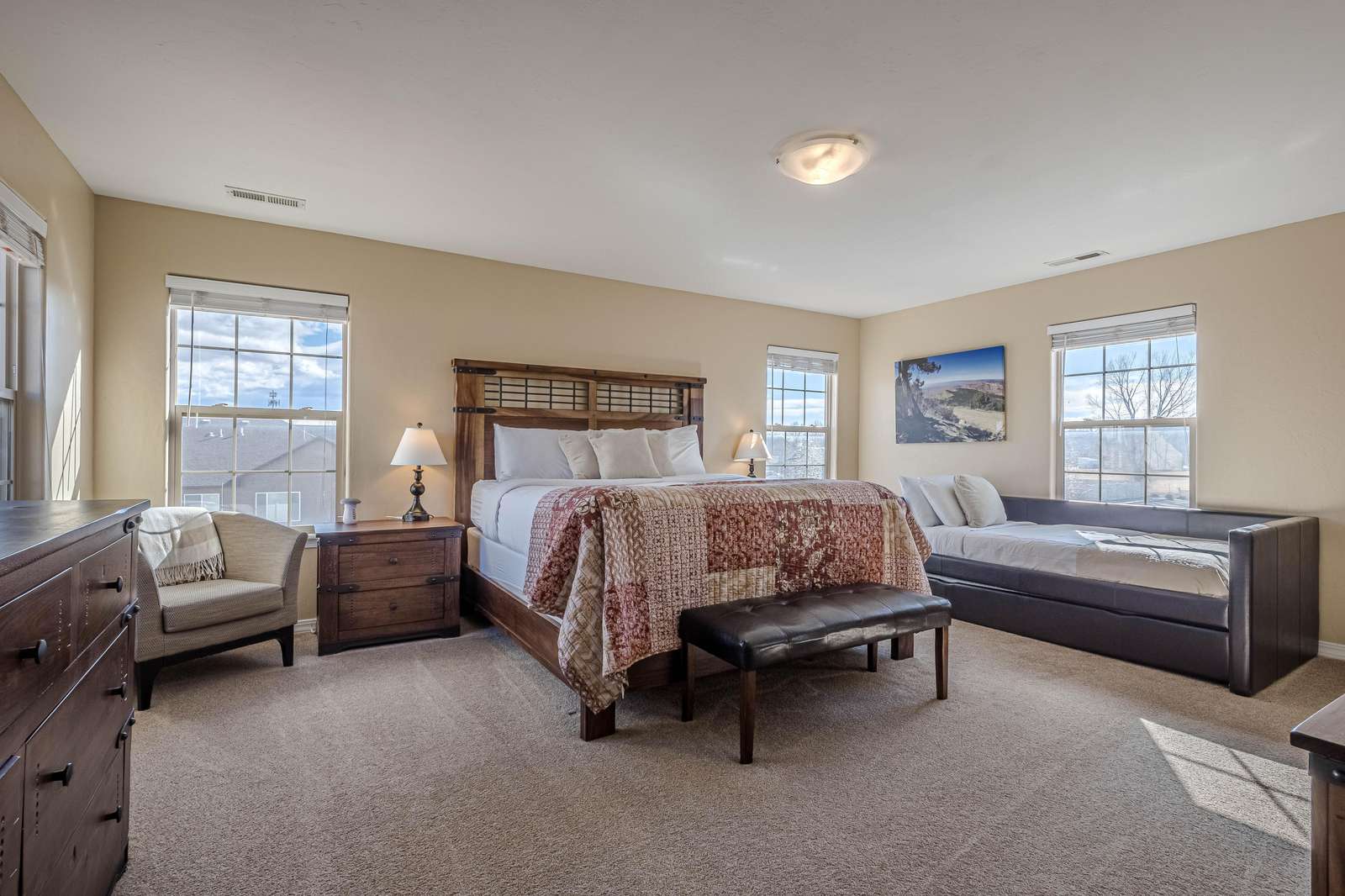 + The master bedroom, located on the 2nd floor, has a king bed, a twin trundle, a TV, a walk-in closet, and a full ensuite bathroom! It includes a toilet, dual sinks, a step-in shower, and a jetted tub.