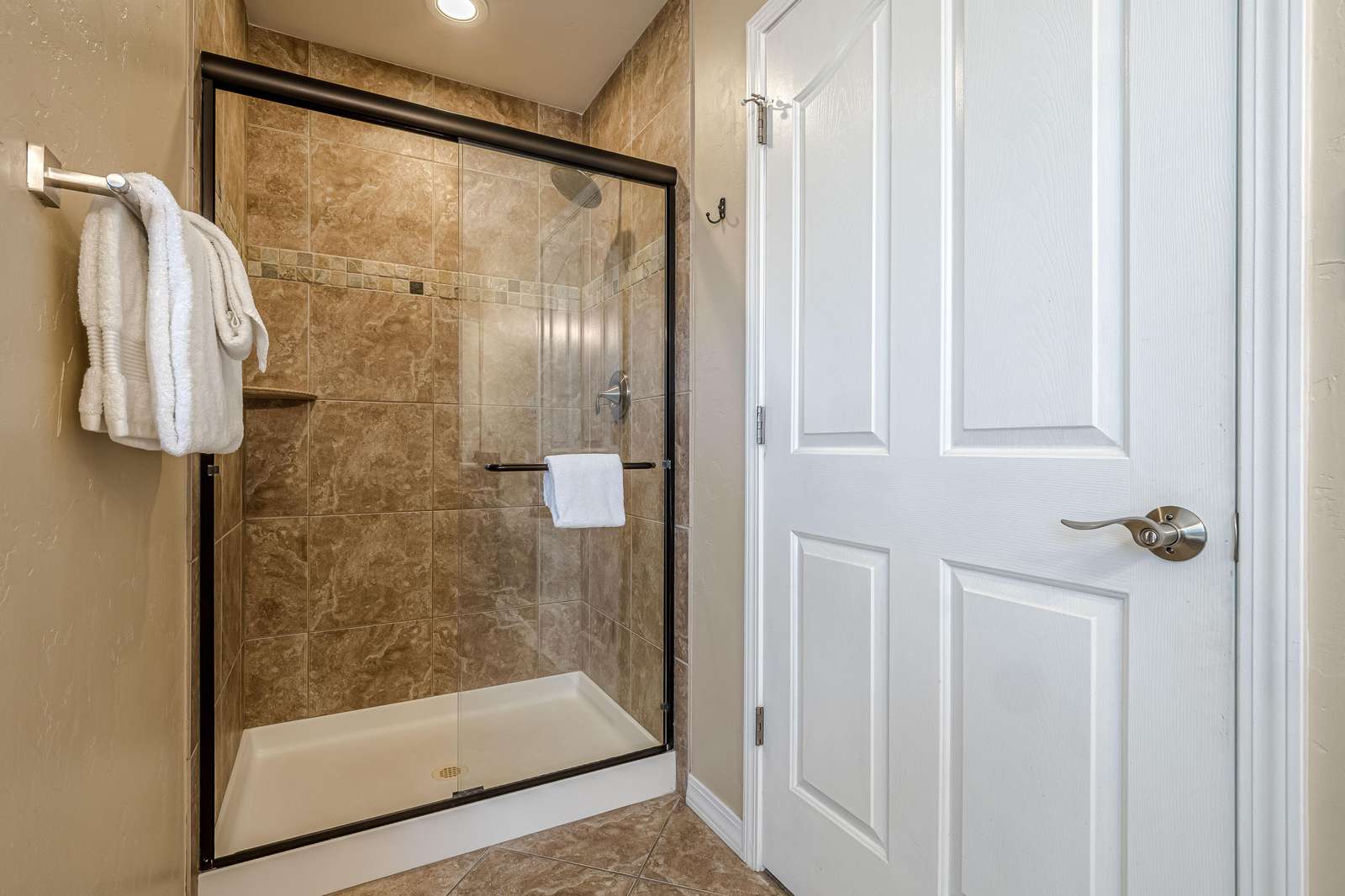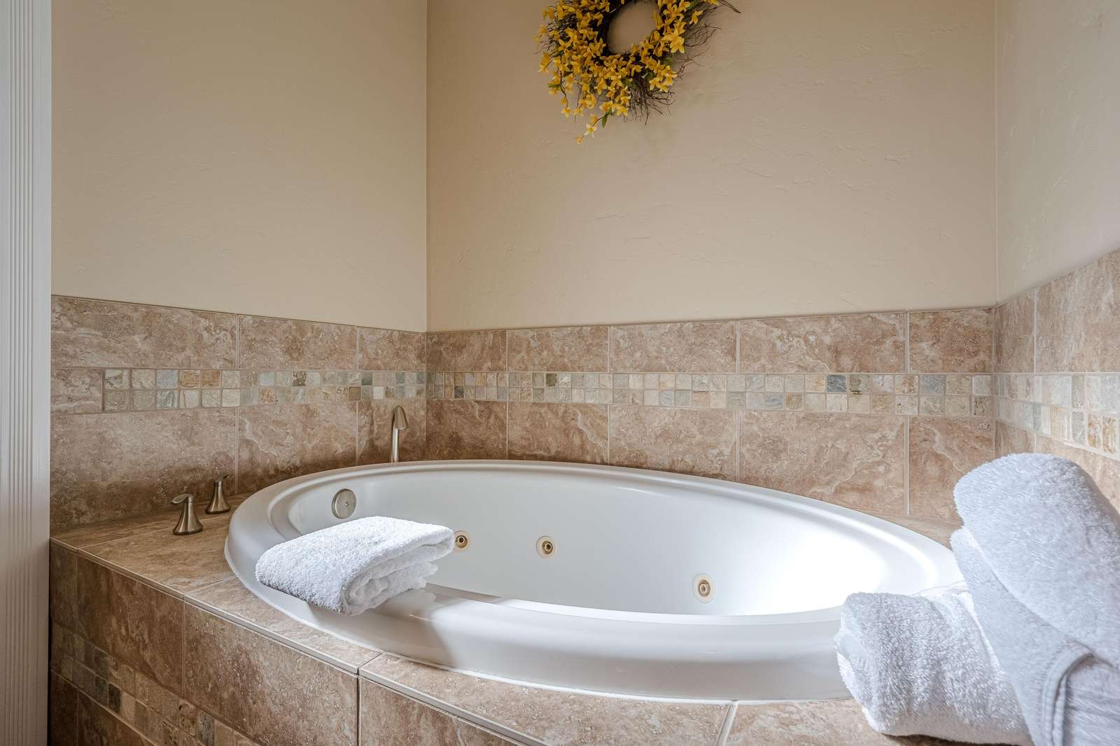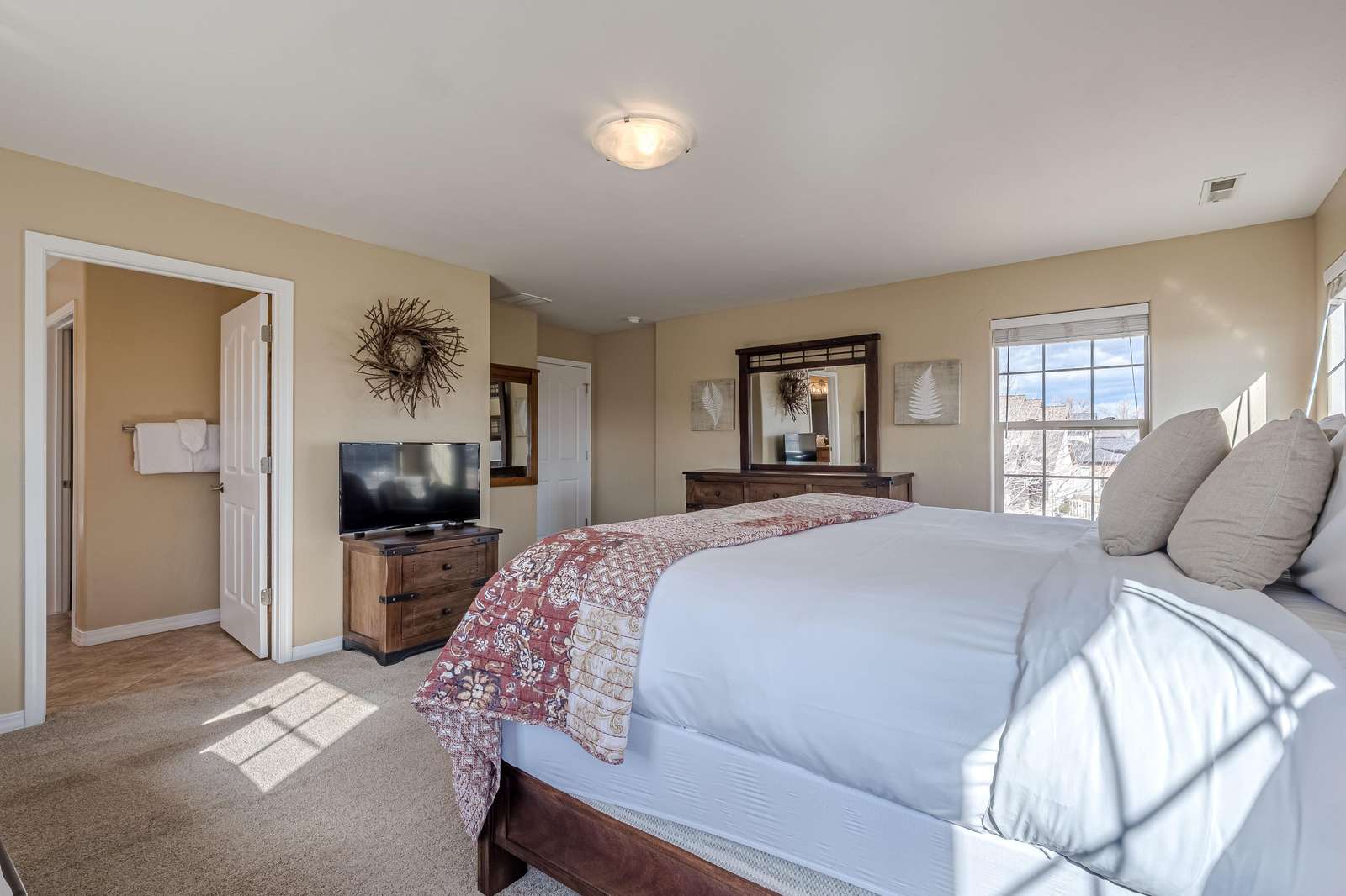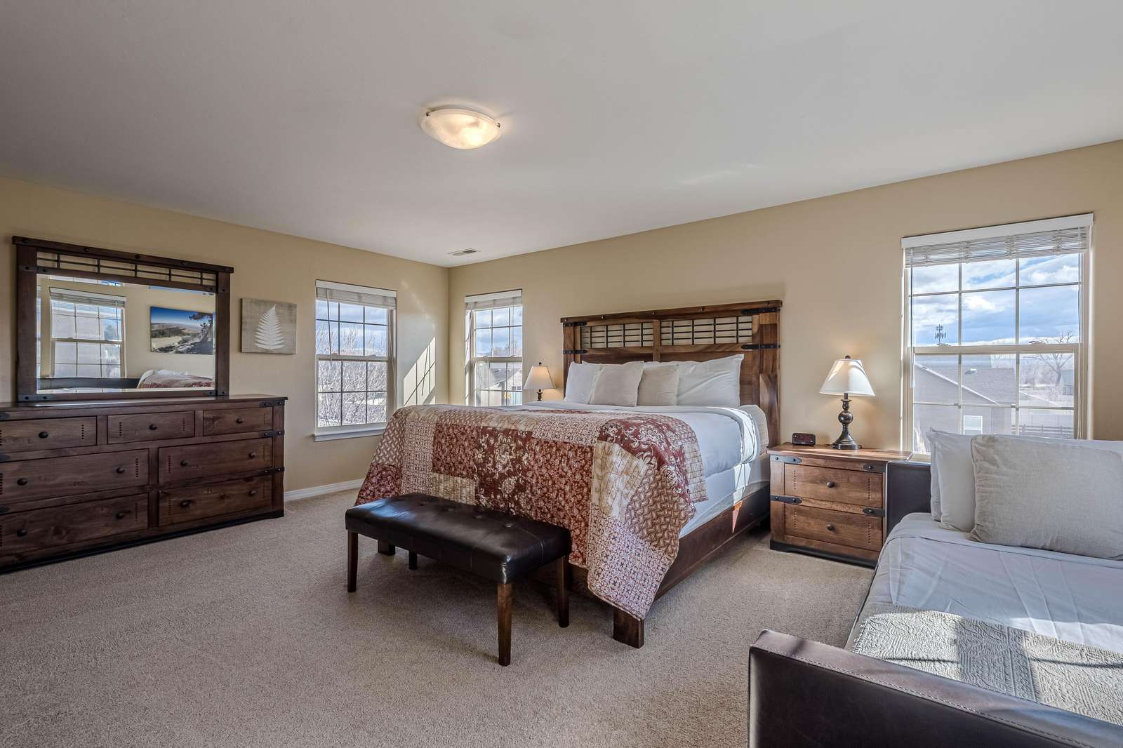 + The master bedroom, located on the 2nd floor, has a king bed, a twin trundle, a TV, a walk-in closet, and a full ensuite bathroom! It includes a toilet, dual sinks, a step-in shower, and a jetted tub.