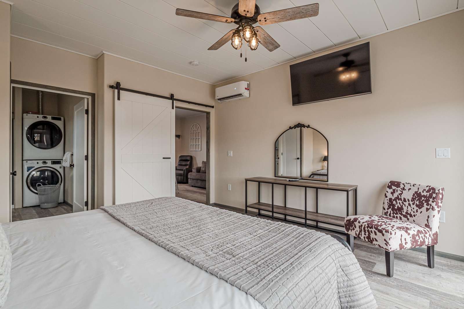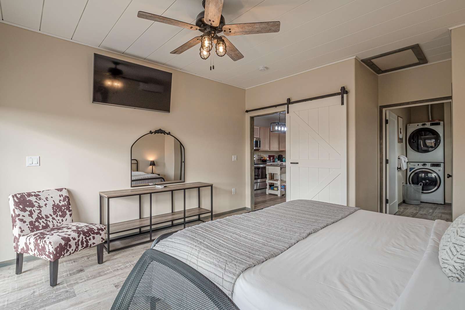 + The 2nd Master bedroom has a king bed, TV, and a full ensuite bathroom! Includes a toilet, sink, a step-in shower, a washer, and a dryer.