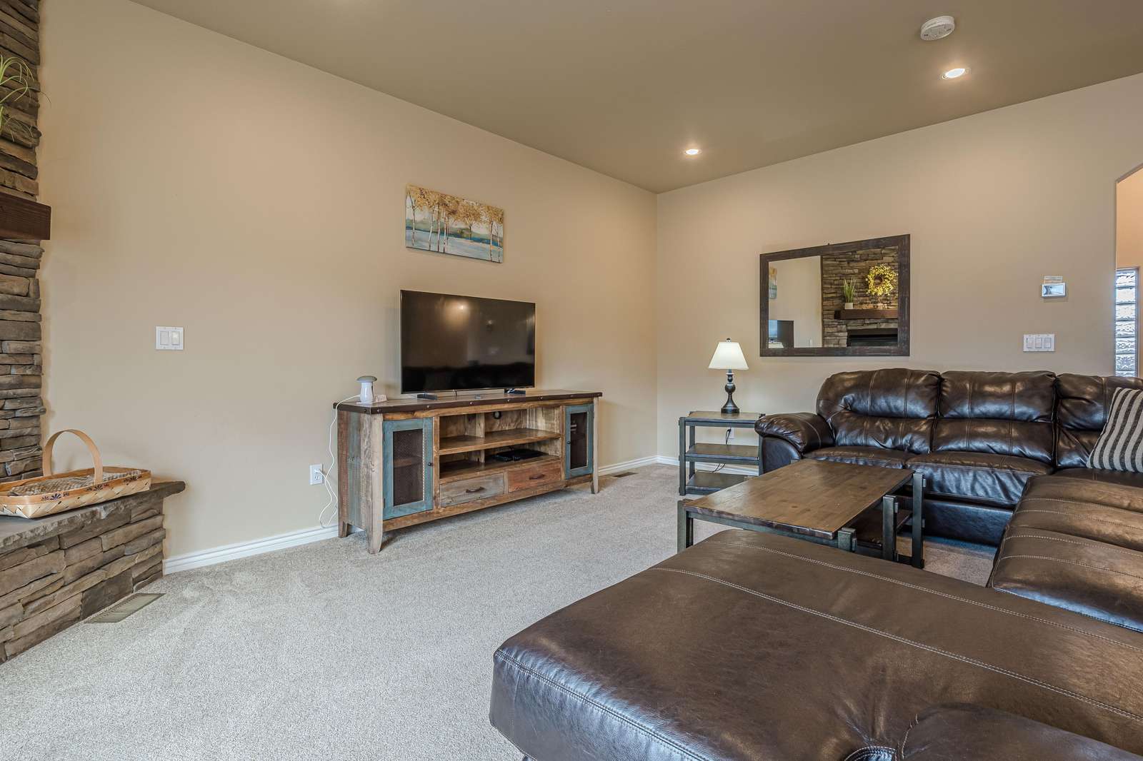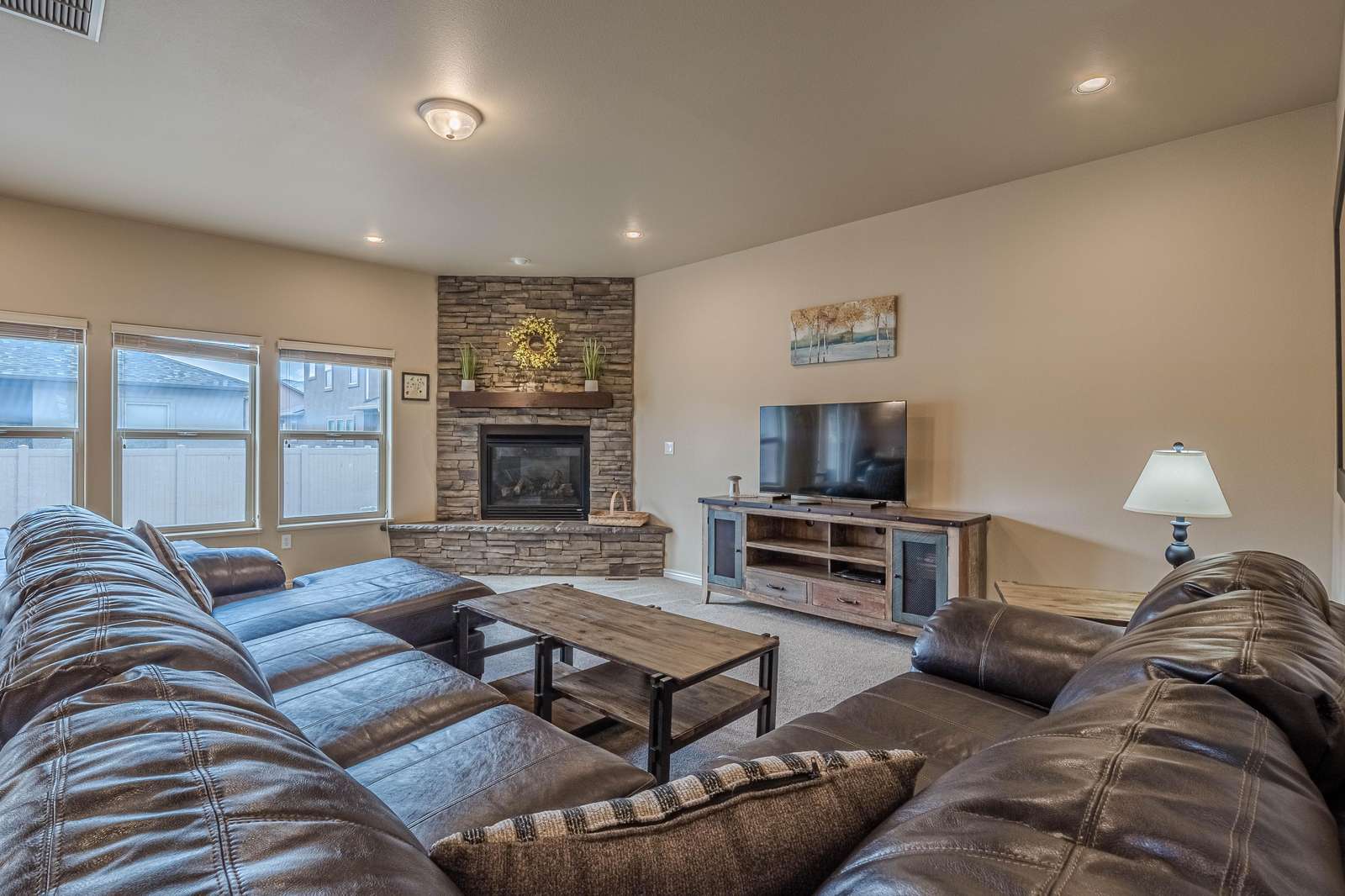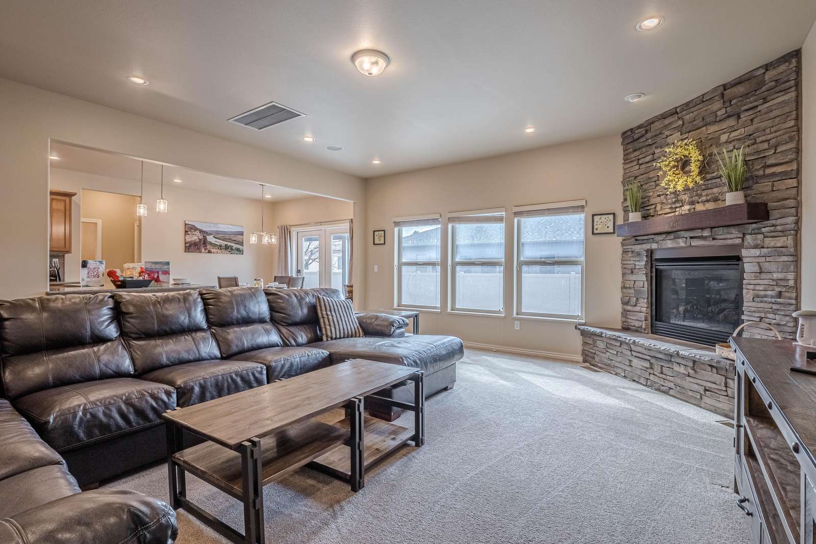 + Spacious Living Area: Unwind in the roomy living room featuring a large sectional sofa, big screen smart TV, and a cozy gas fireplace, offering the ideal setting for relaxation and entertainment.