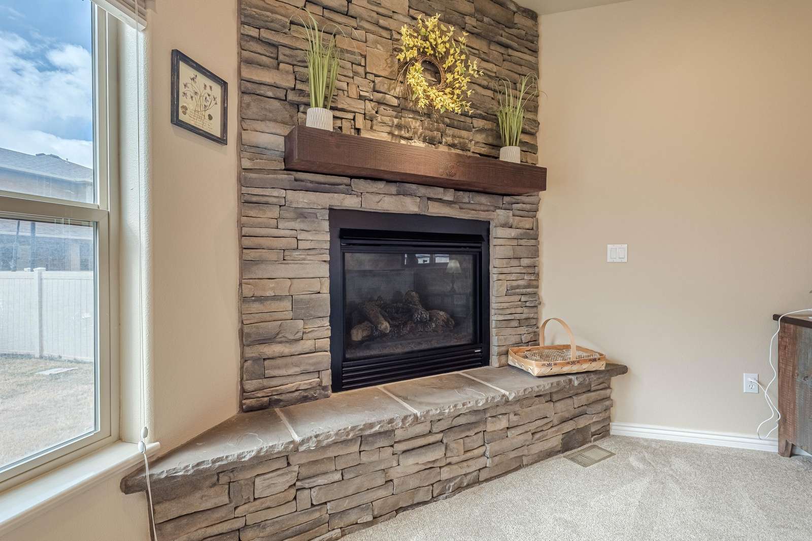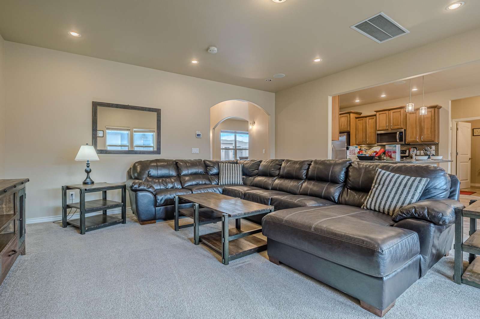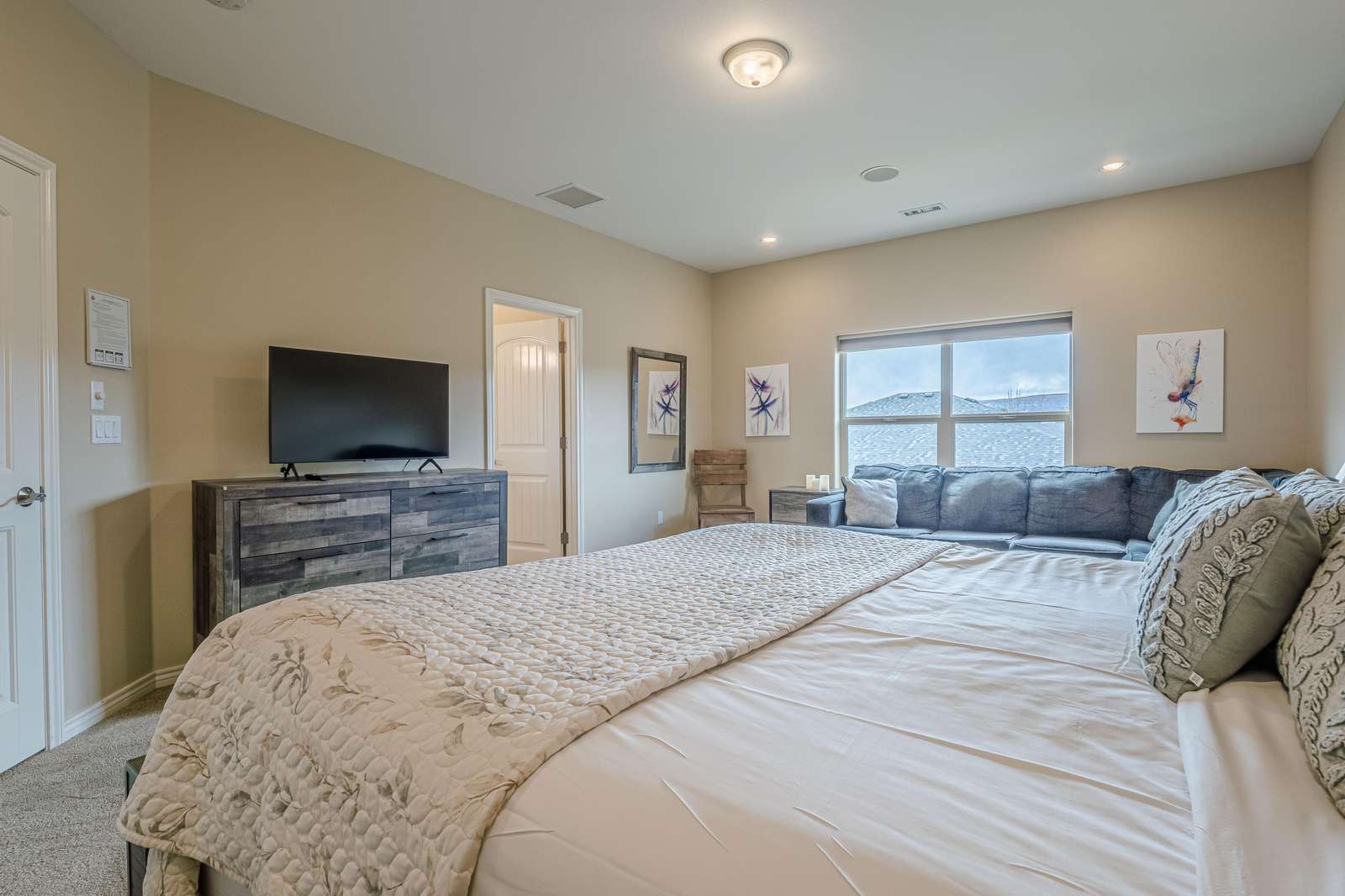 + Spacious Living Area: Unwind in the roomy living room featuring a large sectional sofa, big screen smart TV, and a cozy gas fireplace, offering the ideal setting for relaxation and entertainment.