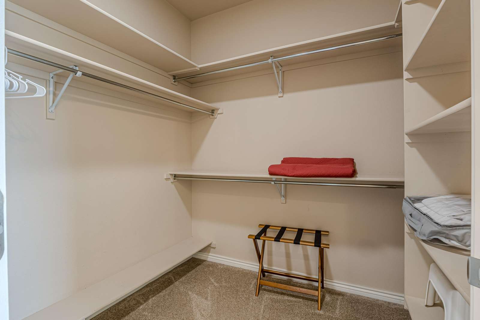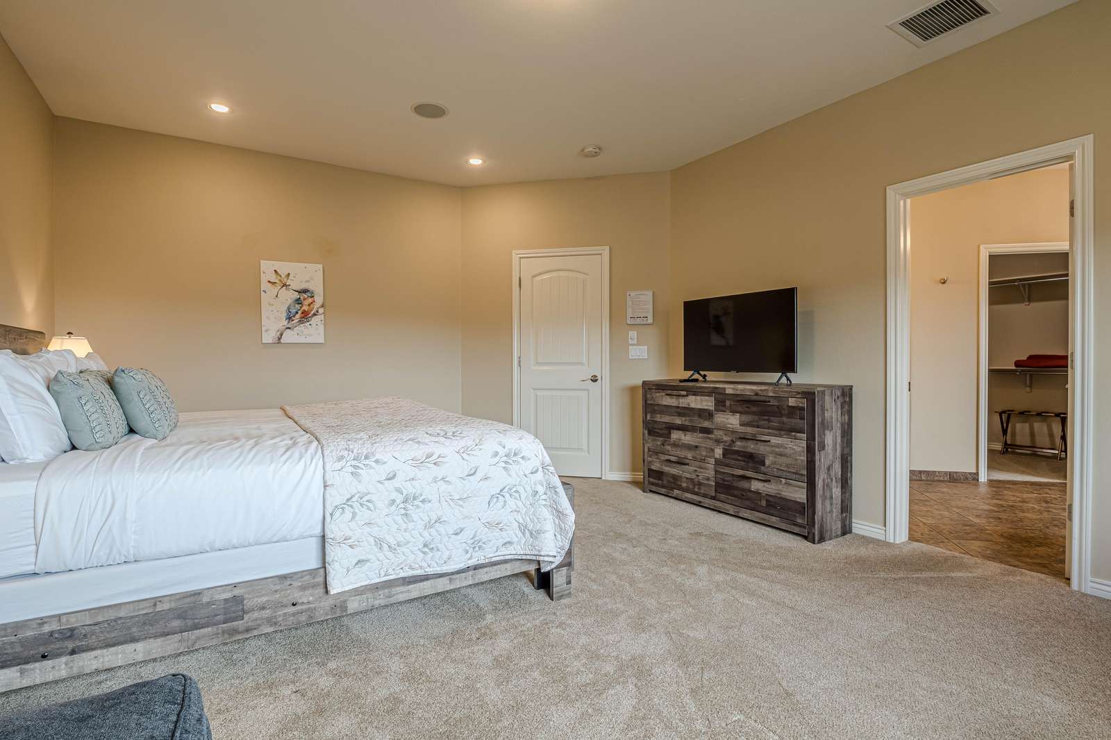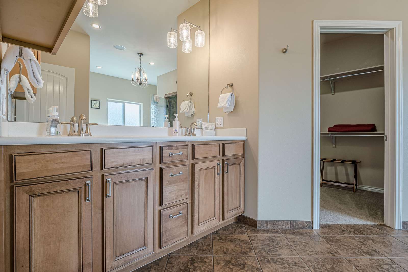 - Full ensuite bath with double sinks, a private toilet area, walk-in shower, and a large jetted tub.