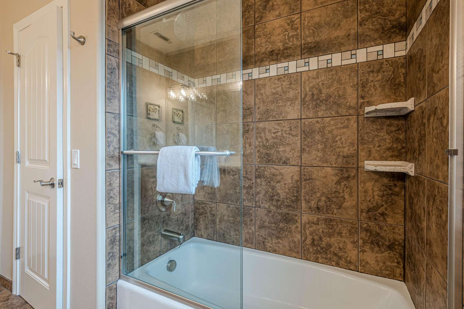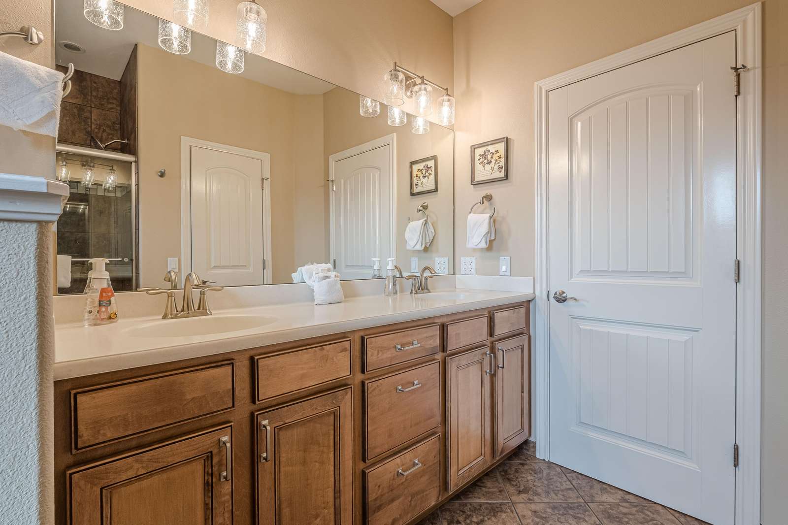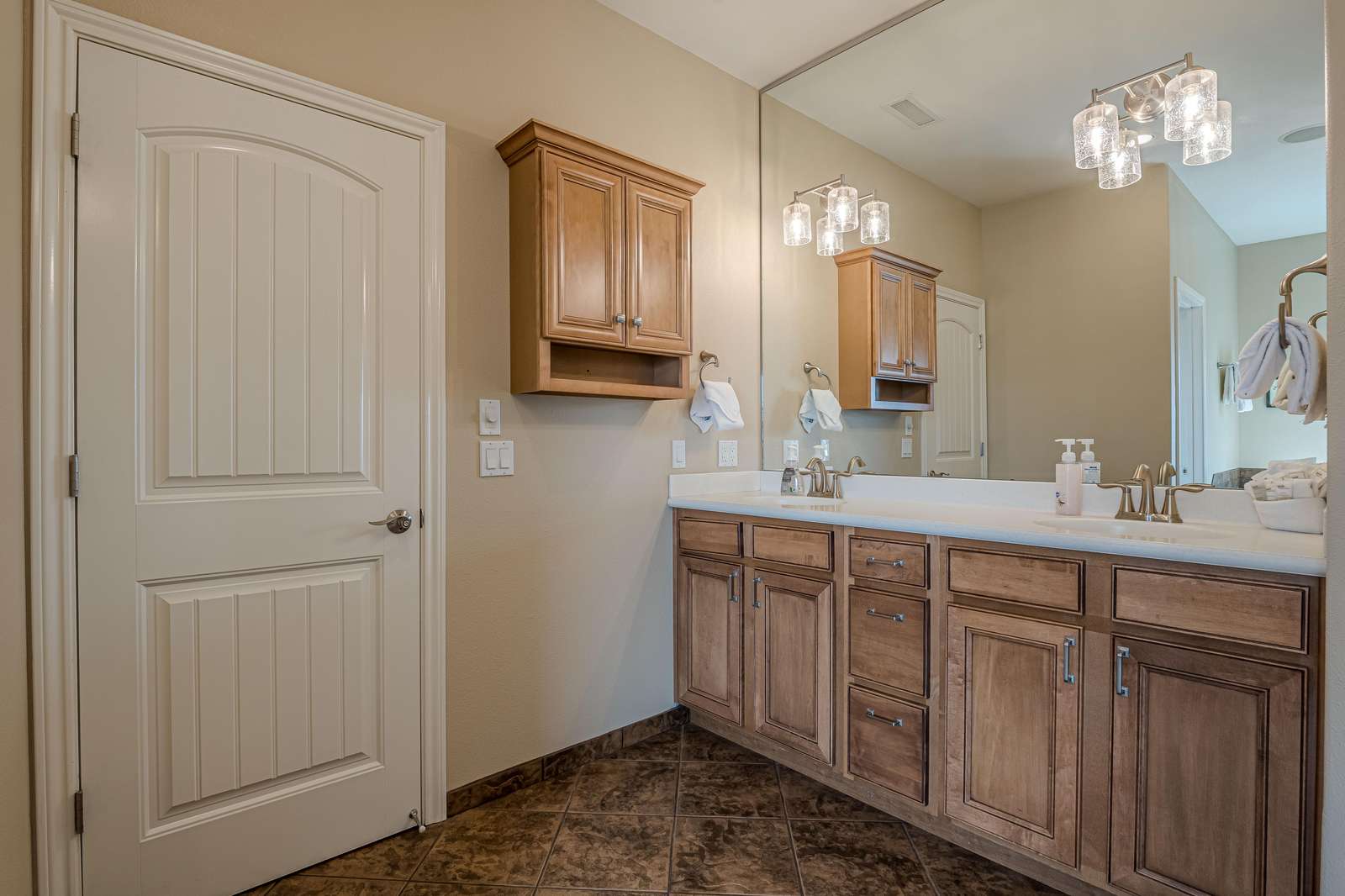 + The shared hallway bath located on the upper level has double sinks, a shower/tub combo, a toilet, and extra storage space.