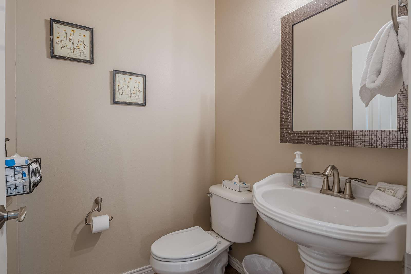 + The shared half bath conveniently located off the kitchen has a single sink and toilet.